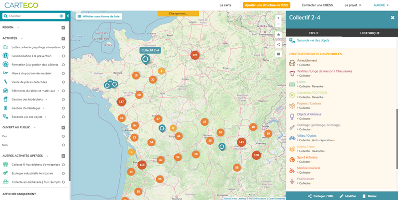 Carteco permet ainsi de valoriser les acteurs ESS de l’économie circulaire qui peuvent directement se répertorier sur la plateforme et actualiser leurs informations lorsque c’est nécessaire.