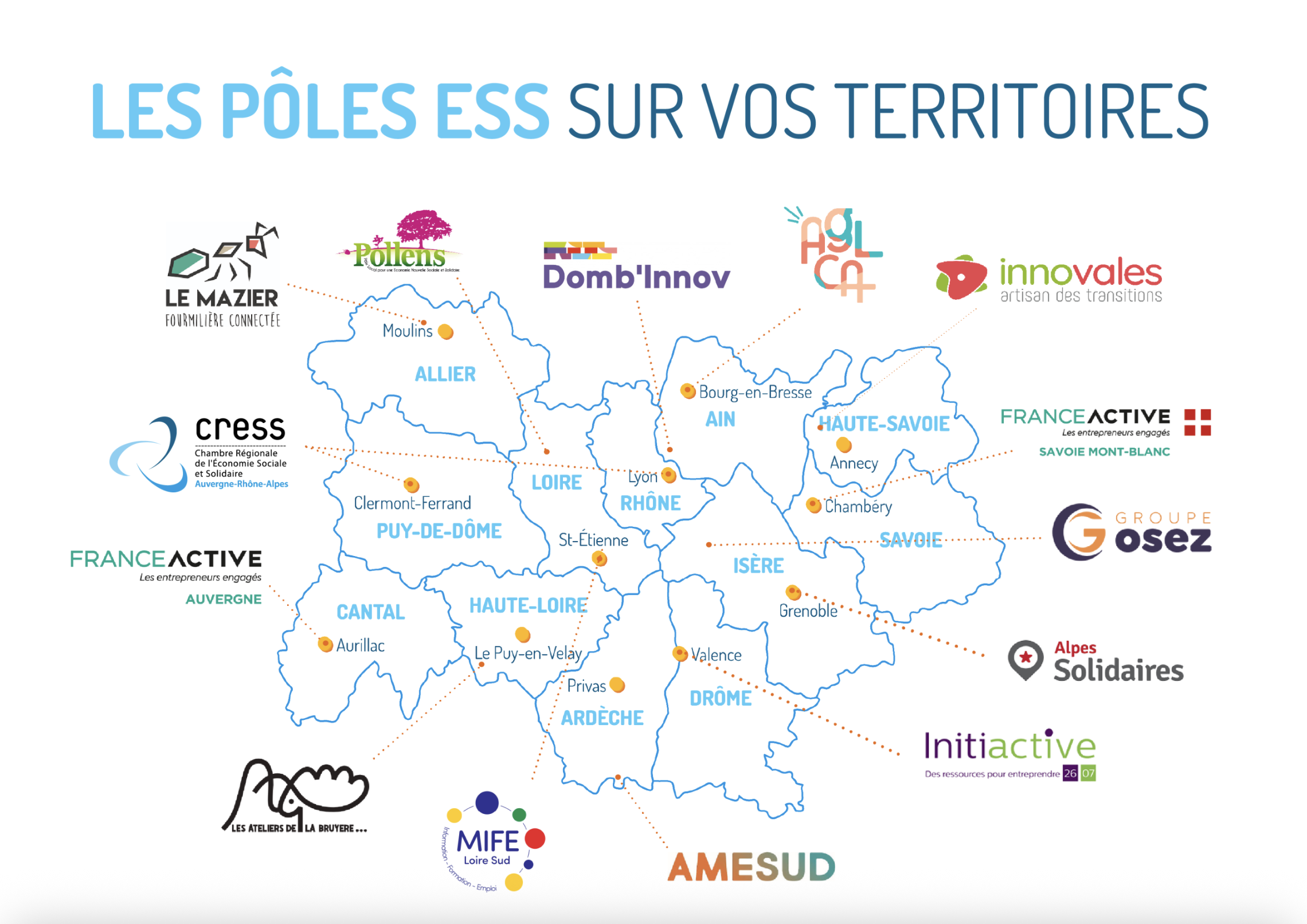 La CRESS Auvergne-Rhône-Alpes continue de consolider le maillage territorial, avec l’aide des Pôles ESS, les relais locaux sur vos territoires. Il s’agit d’adhérents avec un ancrage local fort, qui sont des lieux ressource en matière d’Economie Sociale et Solidaire, pour les habitants et les acteurs économiques de leur territoire d’action. Ils prennent part activement au mouvement régional, en développant des actions de promotion et de sensibilisation à l’ESS. En d’autres termes, ce sont des ambassadeurs de l’ESS près de chez vous !